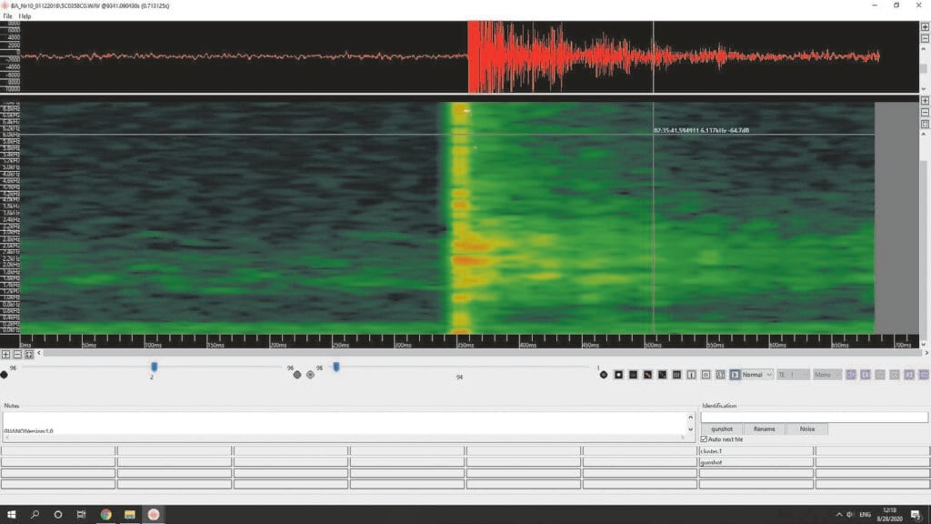 Spectrogramă a unui foc de armă detectat de AudioMoth și vizualizat cu ajutorul software-ului de analiză Kaleidoscope