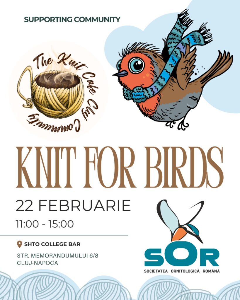 În 22 februarie te invităm la Knit For Birds, alături de comunitatea de crafteri the_knit_cafe_cluj, unde andrelele, croșetele și firele se vor implica în efortul colegilor de la SOR Cluj de a aduce comunității cea de a doua ediție a „Atlasului Păsările Clujului”.