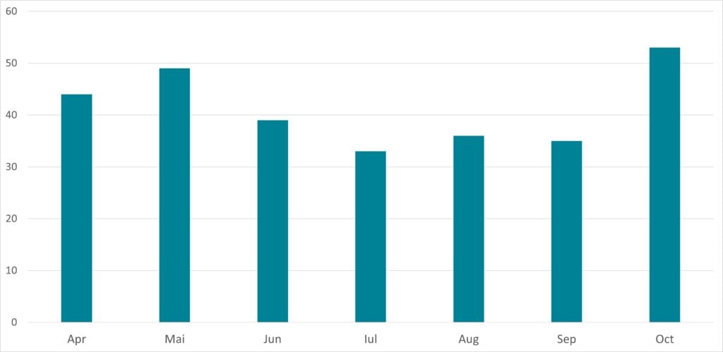 Cea mai mare veste – și poate cea mai încurajatoare dintre toate – este faptul că în octombrie am avut cel mai mare număr de observatori activi de când am început competiția! 53 de persoane pasionate au încărcat cel puțin o listă completă, depășind cu mult media obișnuită de 30-40 de participanți. Acest fapt ne bucură cel mai mult, înseamnă că mesajul nostru începe să dea roade. Tot mai mulți observatori decid să colecteze datele sub formă de listă completă. Sperăm că realizarea importanței listelor complete să fie unul dintre principalele motive care au dus la această evoluție.
