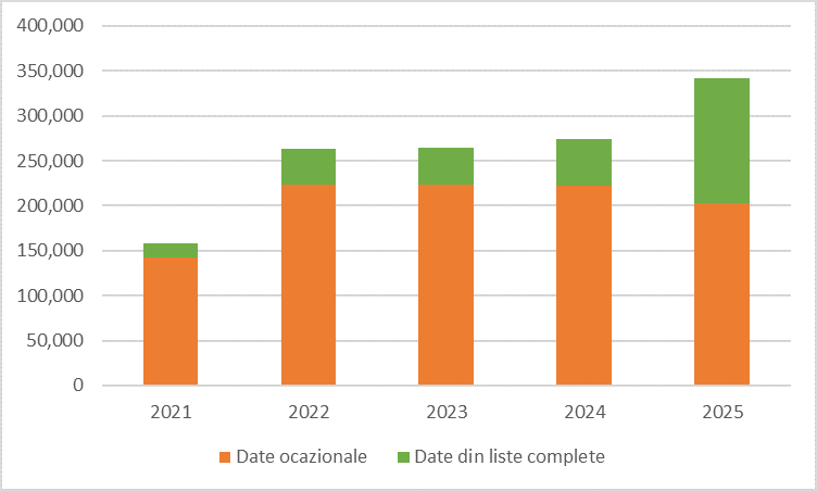 Mai mult, nu doar cantitatea înregistrează o creștere constantă, ci și calitatea: observațiile de teren ocazionale, colectate structurat sub formă de Liste Complete, încep să dobândească o pondere substanțială din totalul datelor nesistematice. În 2025, comparativ cu anii precedenți, am ajuns la peste 40% ca pondere a datelor din Liste Complete din totalul observațiilor nesistematice. Acest aspect se datorează în special implicării mai serioase a voluntarilor noștri, precum și a campaniilor de informare legate de importanța majoră a colectării de date sub această formă.