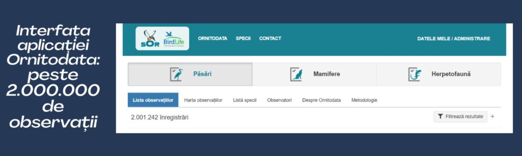 Un moment simbolic, dar foarte important a fost atins: Ornitodata, baza de date a Societății Ornitologice Române (SOR), a înregistrat observația publică cu numărul 2.000.000! Acest aspect are și o importanță științifică evidentă: implicarea voluntarilor în colectarea de date observaționale despre avifaună a atins deja și în România un nivel de performanță care, prin valoarea datelor colectate, ne oferă posibilitatea unor analize științifice relevante.