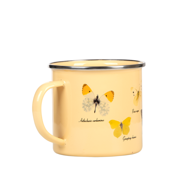 Fabricată din metal emailat, rezistentă și foarte ușoară, cana este decorată cu 9 ilustrații cu fluturi comuni de la noi.