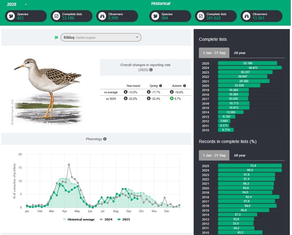 Datele colectate de tine (alături de observatori din tot sud-estul Europei) sunt puse împreună pe platforma SEE Lists, dezvoltată în cadrul LIFE EBP, pentru a trasa tipare fenologice: când sosesc păsările migratoare și când ne părăsesc, care e diferența față de anul trecut sau de media ultimilor ani, în câte liste complete este prezentă o anumită specie etc.
