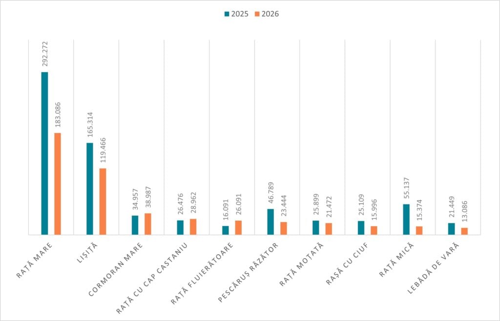 Dintre speciile acvatice, cele mai numeroase efective au aparținut speciilor din graficul de mai jos, în care, pentru comparație, au fost incluse și numerele înregistrate cu ocazia Midwinter 2025. Față de anul trecut, la majoritatea speciilor din top se înregistrează numere mai mici, cu excepția cormoranului mare, raței cu cap castaniu și a raței fluierătoare.