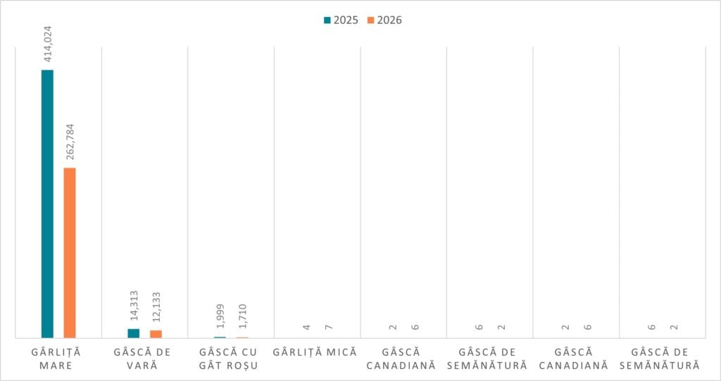 Nu sunt incluse în acest clasament speciile de gâște ale căror efective au fost acoperite mult mai complet de recensământul dedicat, care a avut loc în paralel, în sud-estul României, astfel că datele colectate prin acest program special de monitorizare sunt mult mai precise (fiind acoperite prioritar toate locațiile importante). Numerele complete înregistrate la speciile de gâște din schema dedicată plus cele din Recensământul Internațional al Păsărilor de Apă sunt în imaginea de mai jos, prezentate tot în comparație cu cifrele din 2025.